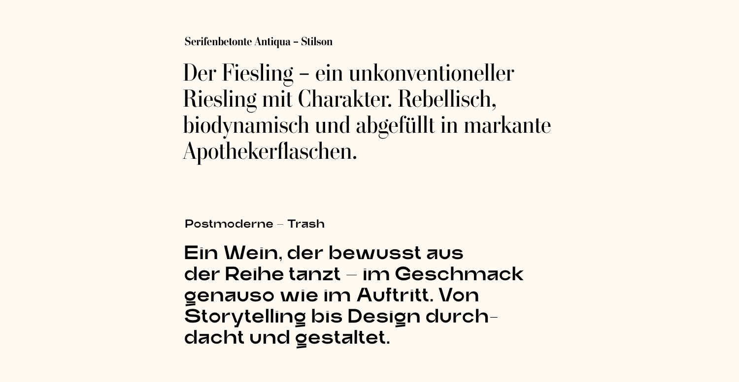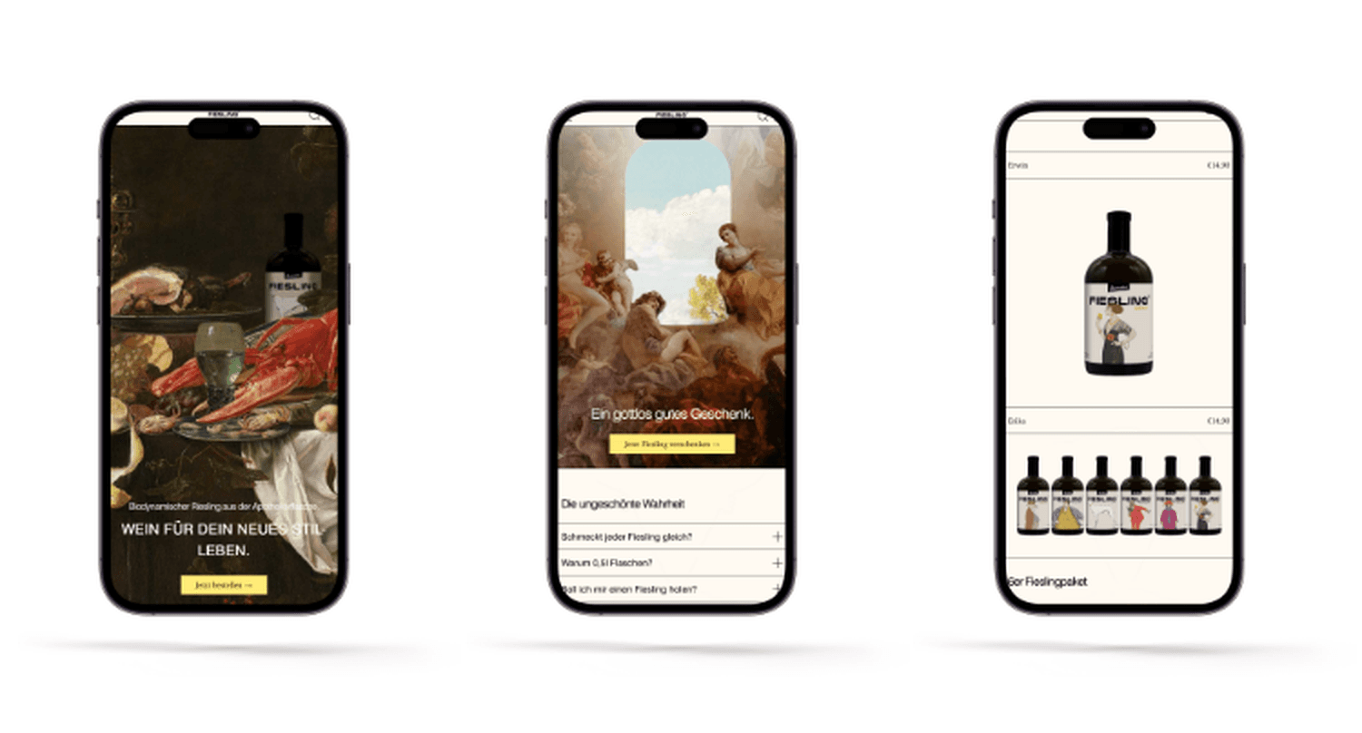 Das Branding ist klar, markant und eigenständig. Die individuell entwickelte Wortmarke trifft auf eine kontrastreiche Typografie und ein durchdachtes Gestaltungssystem. Das Etikett ist reduziert gestaltet – mit Fokus auf die verschiedenen Charaktere, die jedem Wein ein eigenes Gesicht geben. Die Website übersetzt diese Haltung ins Digitale: mit animierten Elementen, emotionaler Ansprache und echtem Appetit auf ein Glas Fiesling.